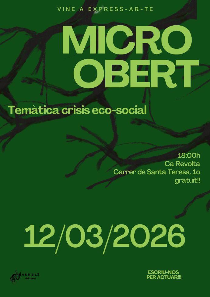 Micro Obert organitzat per Arrels del canvi a Ca Revolta. La temàtica: crisi ecosocial. Música, poesia i qualsevol disciplina artística que vullgueu compartir!