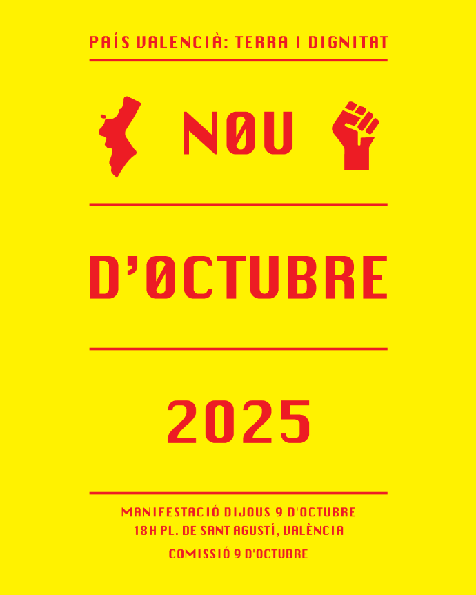 La Comissió 9 d’Octubre ha presentat avui el cartell oficial de la manifestació unitària de la Diada del País Valencià, que té per lema “PAÍS VALENCIÀ: TERRA I DIGNITAT”. Al cartell d’enguany se sintetitza el lema: el perfil del País Valencià, que simbolitza la nostra terra, i un puny alçat indicant dignitat, però també força, unitat i resistència. La manifestació eixirà de la plaça de Sant Agustí de València a les 18.00.