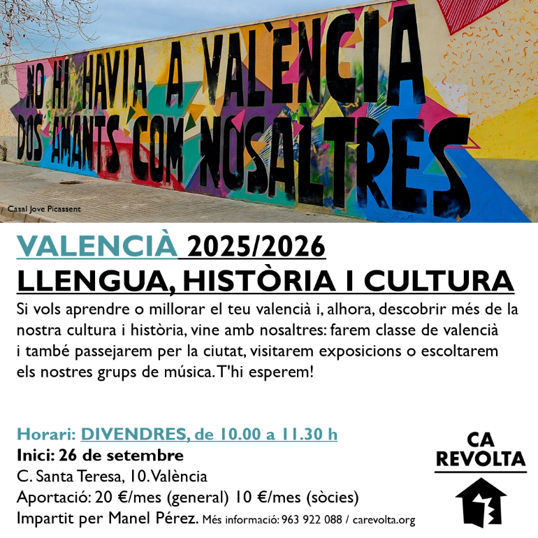 Si vols aprendre o millorar el teu valencià i, alhora, descobrir més de la nostra cultura i història, apunta't al taller: Enguany farem classe de valencià i també passejarem per la ciutat, visitarem exposicions o escoltarem els nostres grups de música. T'hi esperem!
